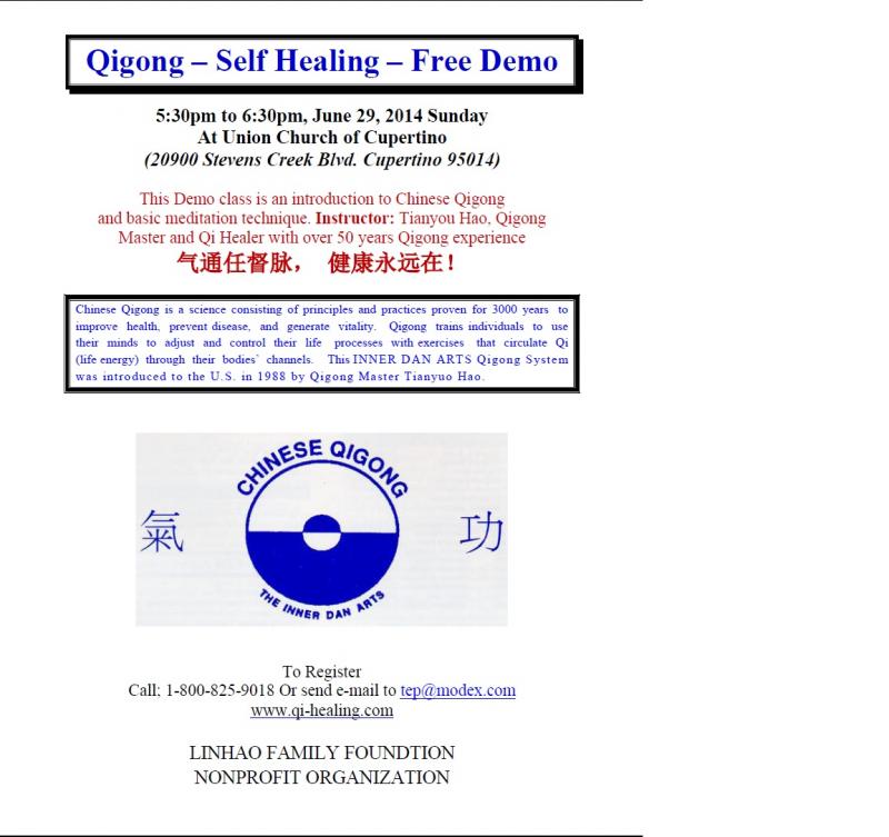 2014 LINHAO Family Foundation administratored total one seminar for the public. The total free seminar is held at Union Church of Cupertino on June 29th 2014. The title of the event is Traditional Chinese QiGong. And apart from last a few years topic, this year the seminar focuses on a few topics.